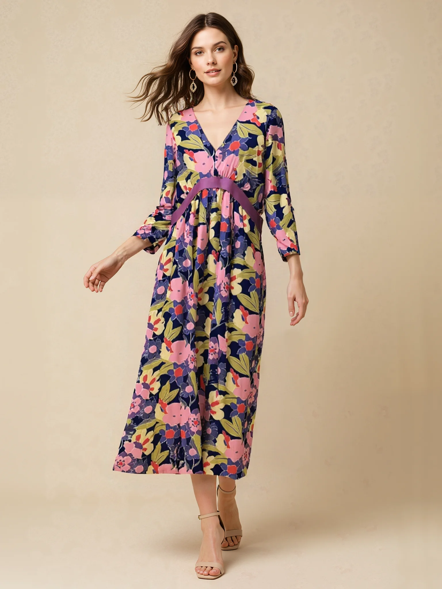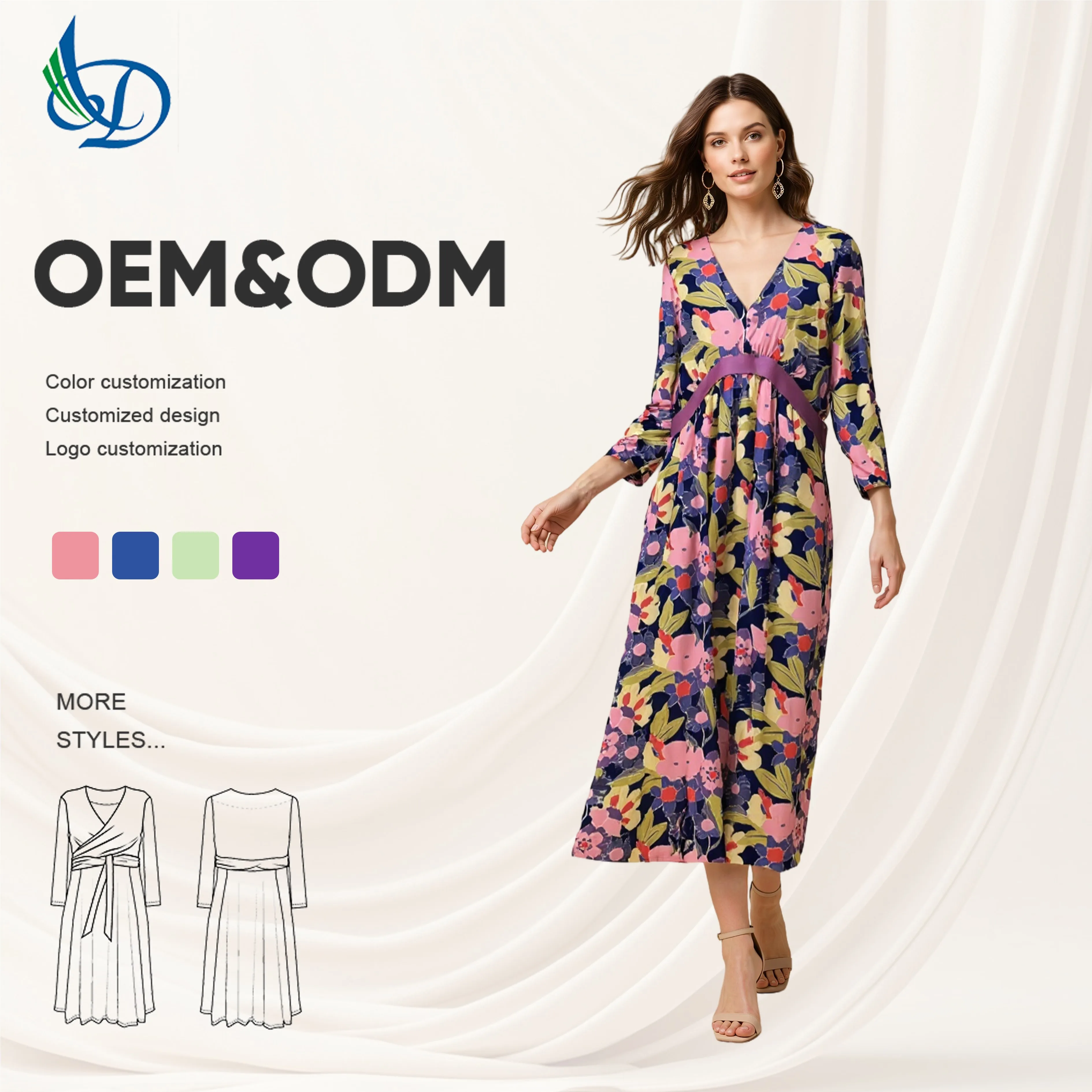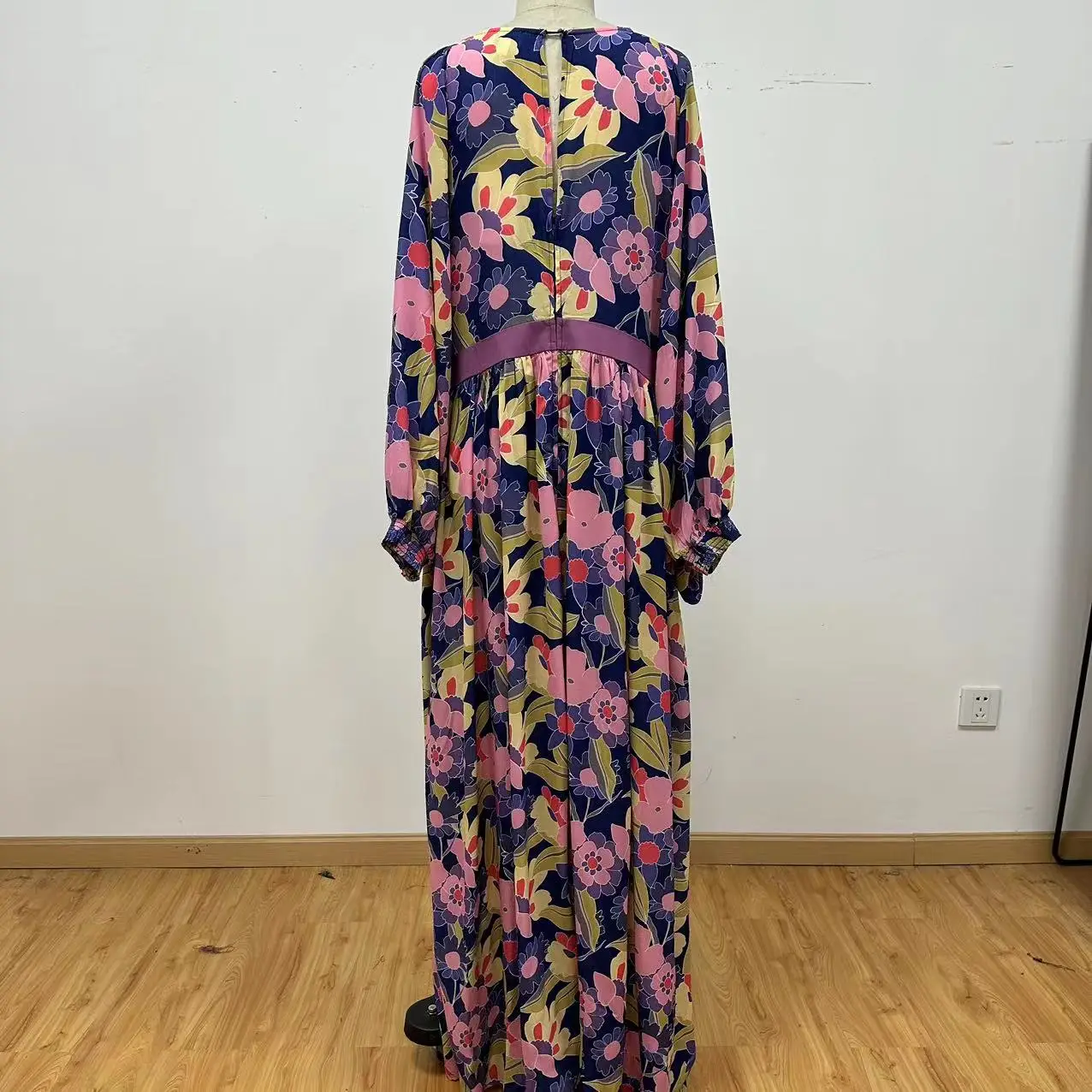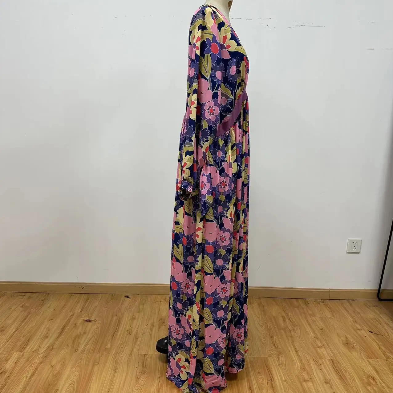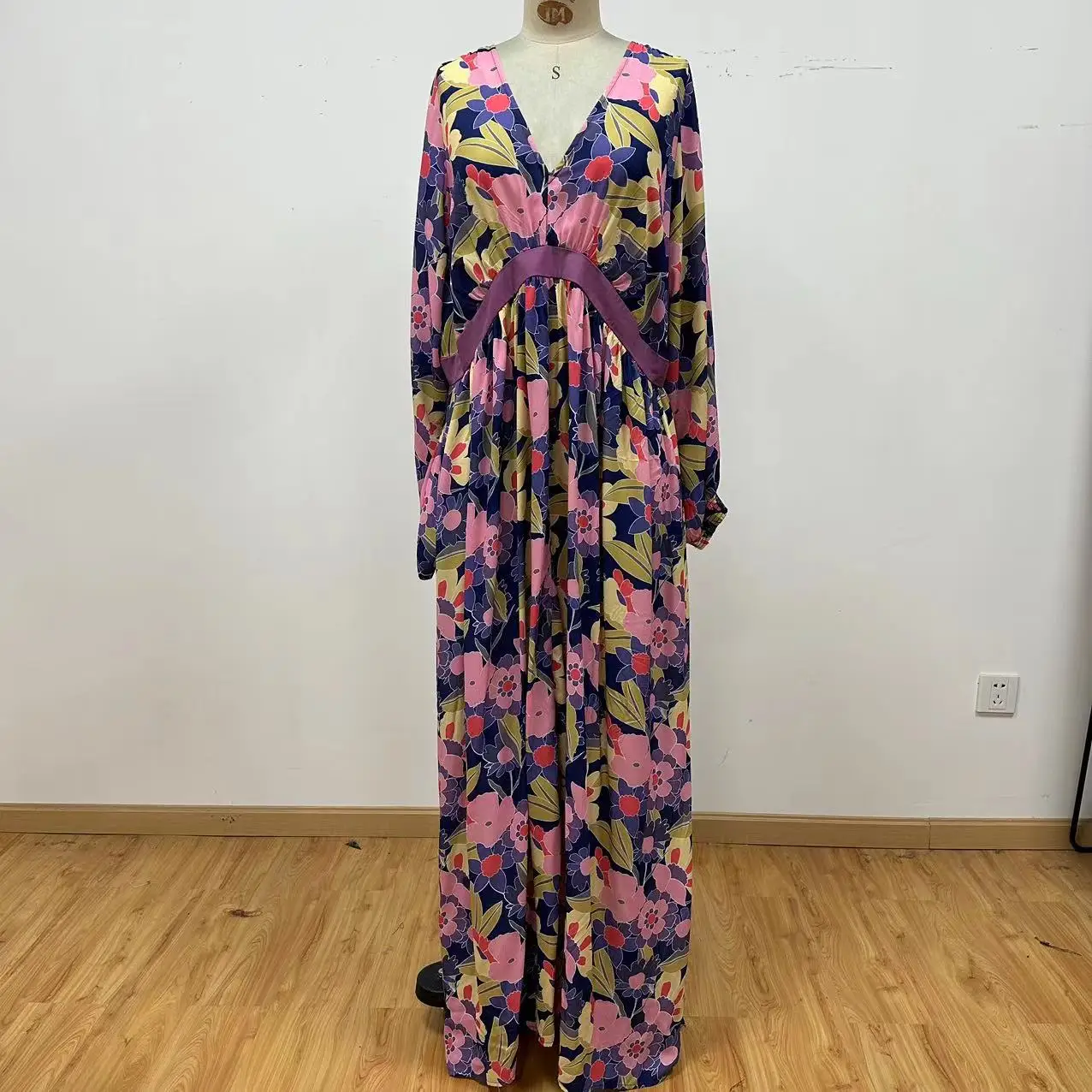 Latest Design Printed Gauze Evening Dresses Plus Size Party Dresses Women V-Neck Dress