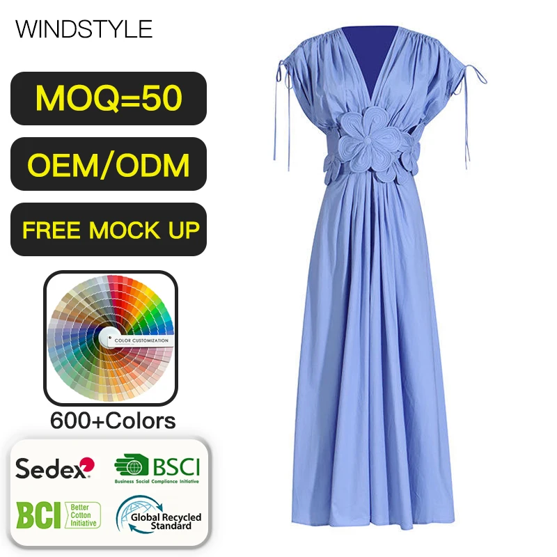 OEM/ODM Elegant Temperament Long Dresses High Waist Large V-Neck Collage Flower Embroidered Casual Summer Dresses for Women